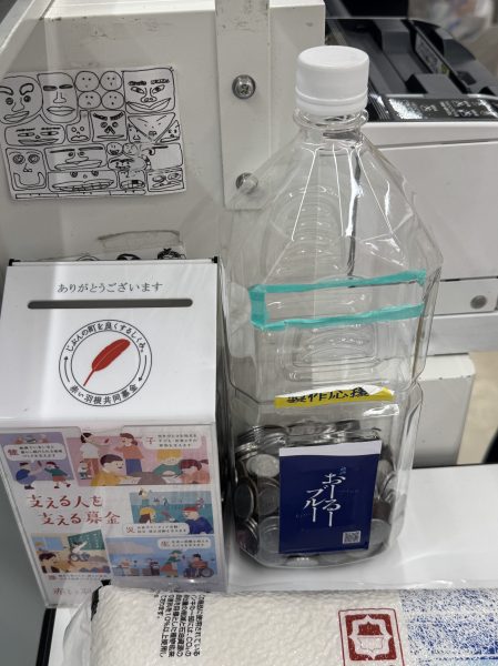 スーパー、コンビニ、居酒屋などのレジに募金箱が置かれていますので、