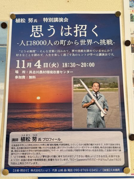 下町ロケットのモデルになったと言われる植松努さんが久米島にいらっしゃり、講演会を行います。