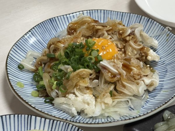 そのミミガーを韓国料理のユッケ風に生卵と一緒にとじて頂きます。
