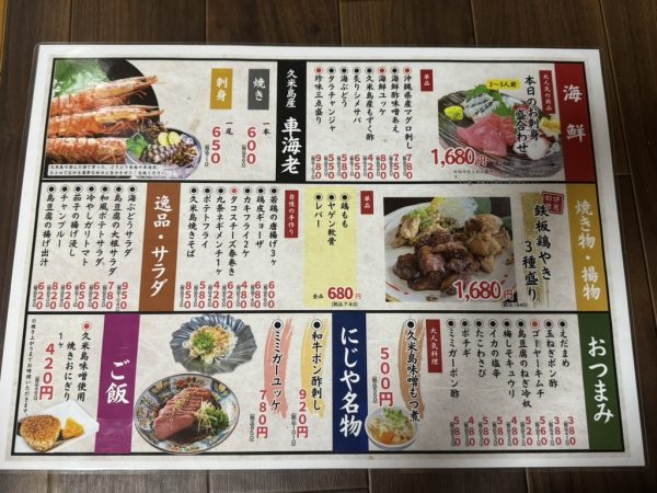 居酒屋メニューが並びますが、久米島の海の幸や特産品を使ったメニューも豊富です。
