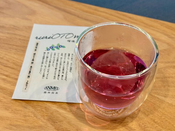 仲地さんのバタフライピーとカカオの葉のはいったお茶「瑠璃おとめ」を飲んで、